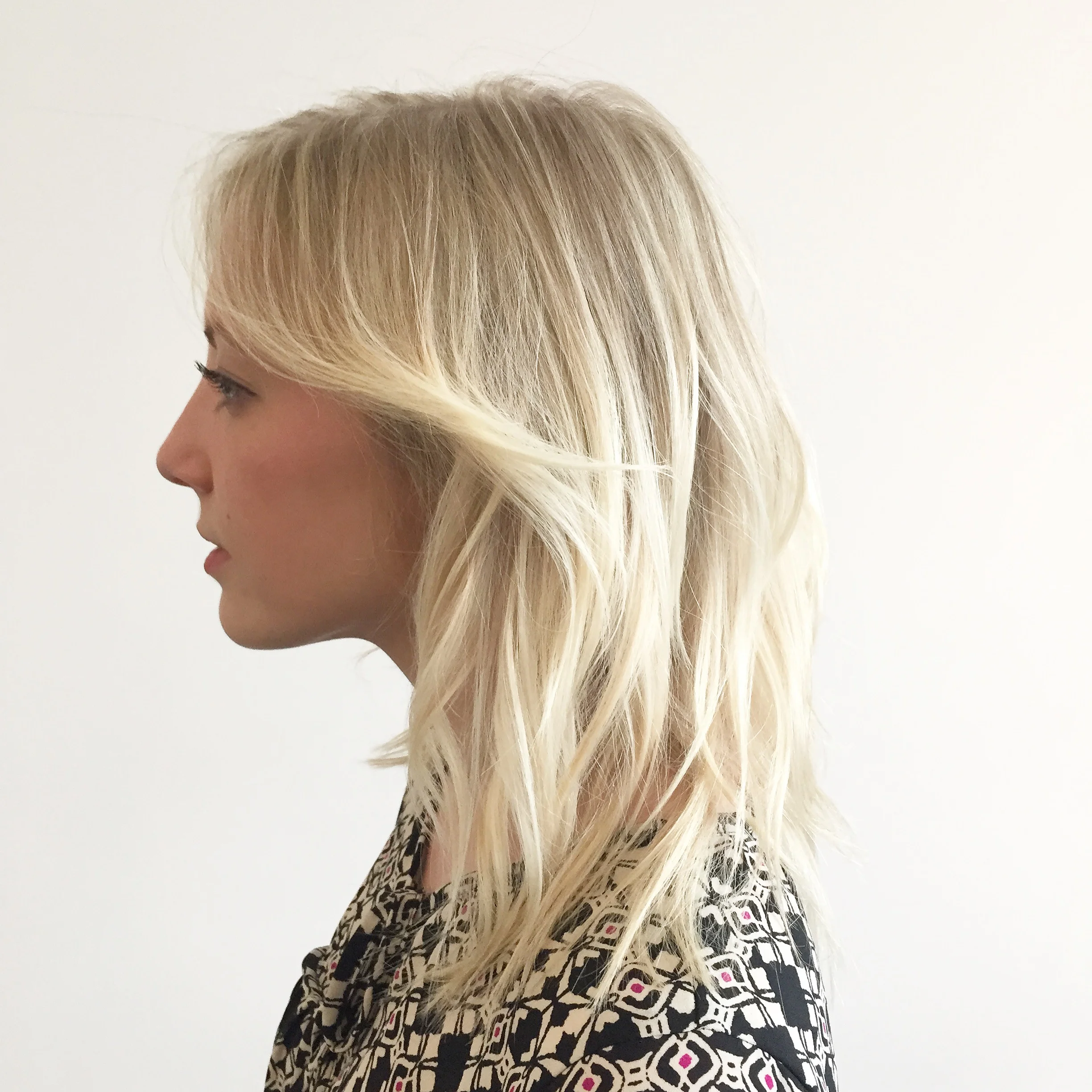 With summer approaching, I knew I wanted to go light blonde again. My hair was fading from a blonde balayage and was starting to look very choppy; brunette on the top portion of my layers and fading down to a bright blonde...in other words, it was time for something new! In terms of cut, I went into my appointment knowing I just wanted a trim to remove the broken ends. My hair is already on the thin side so the thicker and blunter the chop, the fuller it tends to look. I am such a fan of the trending lob right now, so I was hoping my hair would resemble somewhat of the look and feel of a lob when complete. I supplied Jason with an inspiration image collage for color and style and he reassured me it was doable.