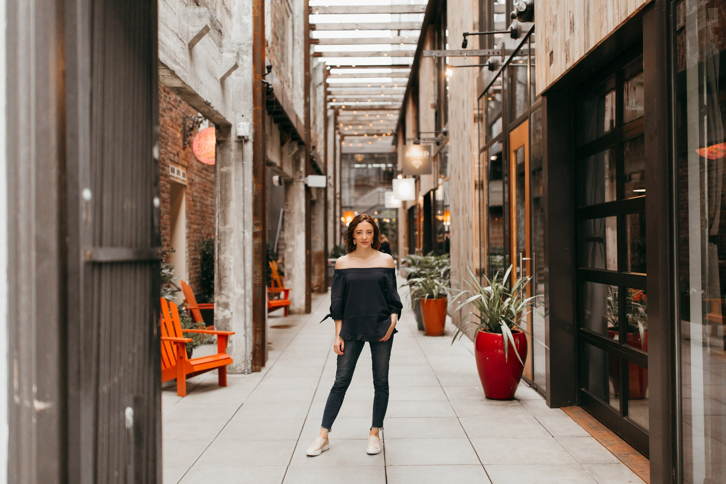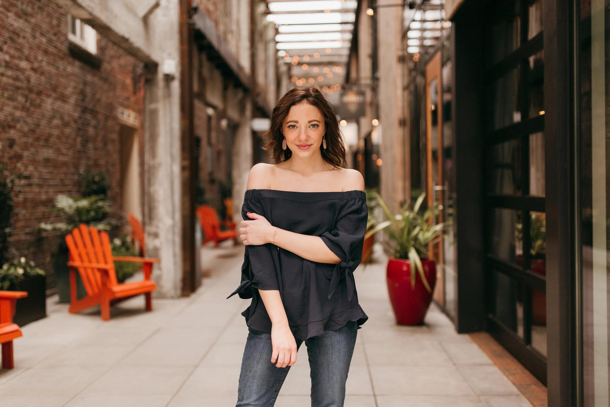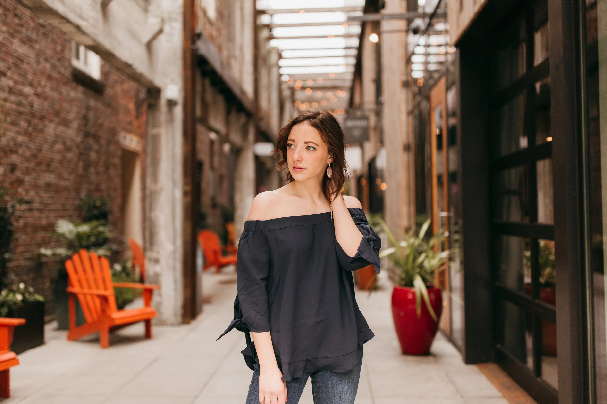 Off the shoulder. In this outfit, I’m embracing the off the shoulder look, one of my favorite spring/summer trends! I have a feeling this 'Juliet off the shoulder top' from Verity is going to be one of my spring staples. This navy top has just the right amount of detailing to give an ordinary off the shoulder top a little flare. The fit is more on the flowier side and the fabric is lightweight and excellent for warmer days to keep you cool. The flared out bottom is also a fun, feminine touch! Not to mention, the ¾ length sleeves also provide some option play for accessorizing with bracelets or bangles. The bow tie detailing on the sleeves is also a personal favorite touch.
