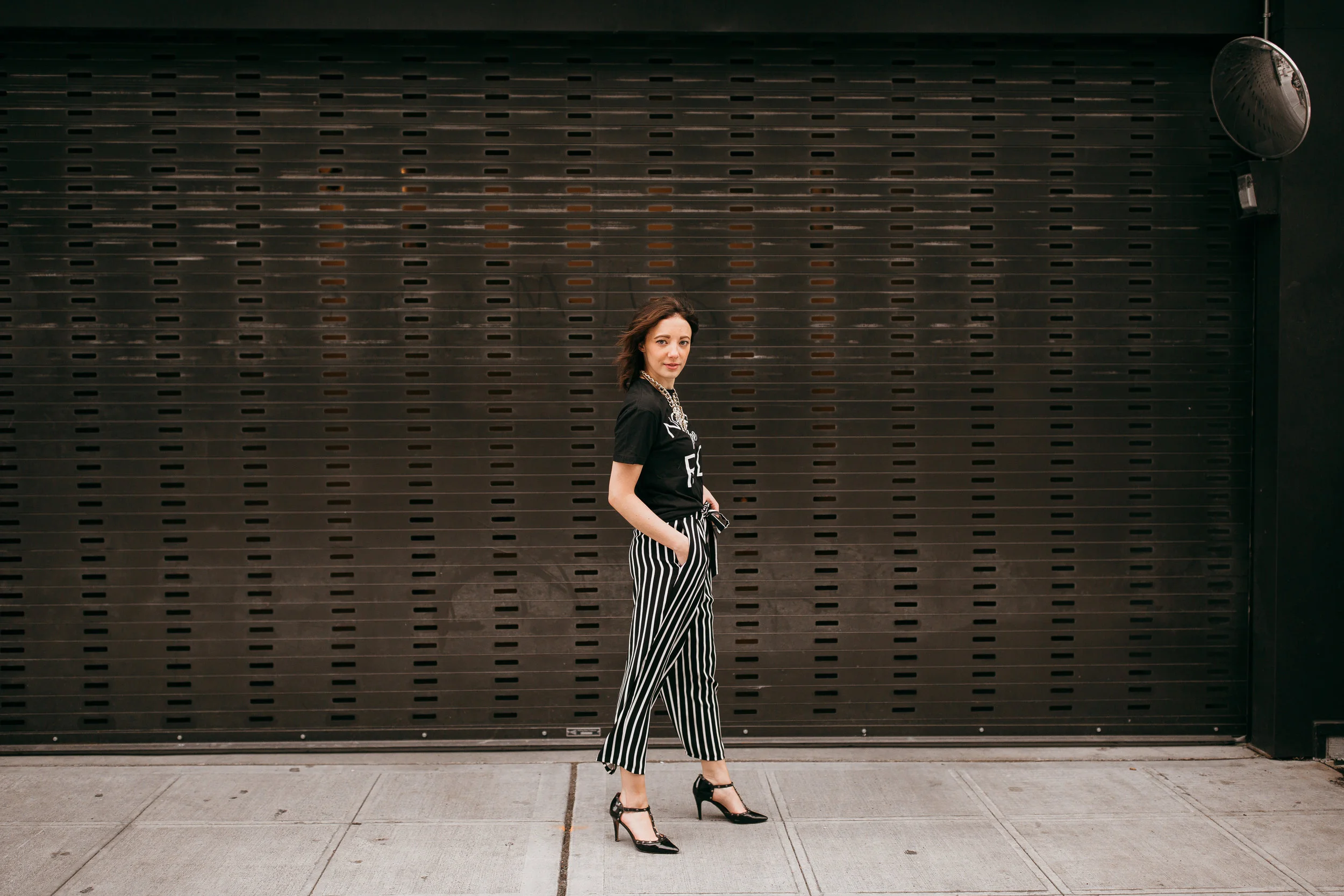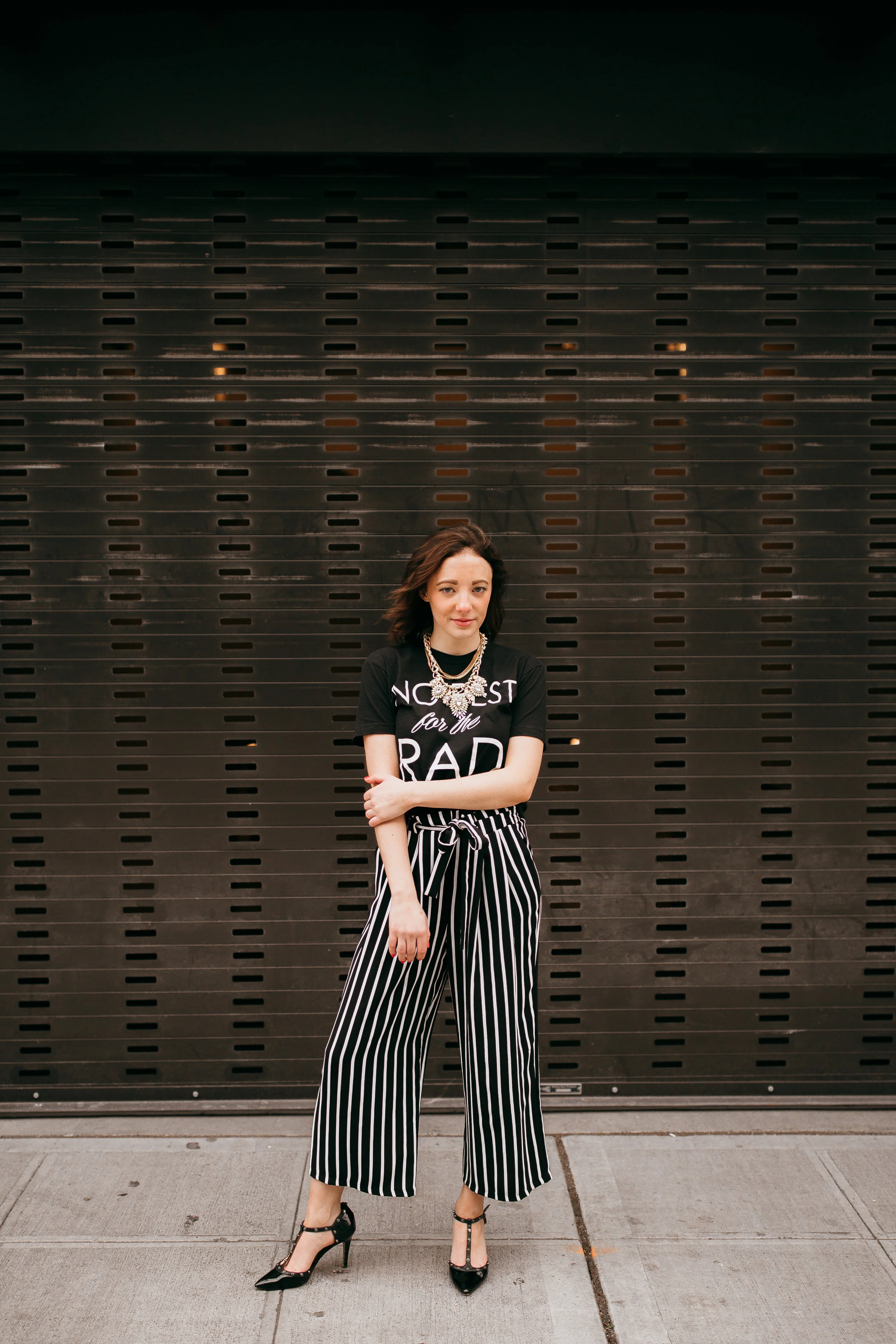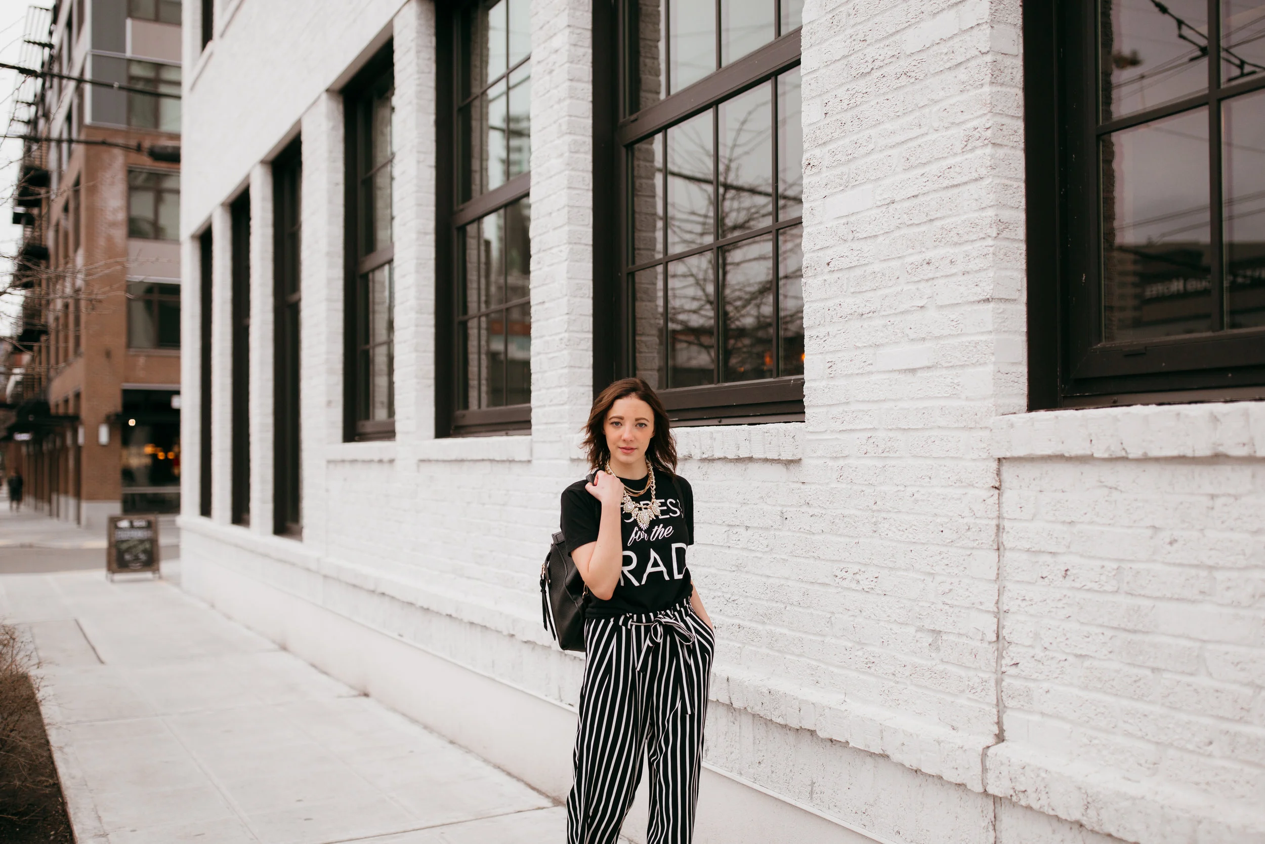 When I spotted these striped ZARA trousers with the frontal waist tie I immediately started picturing how I wanted to style these pants for spring. Yes, they're monochrome (big surprise) but that's one of the reasons I love them -- they go with everything. The stripes are more on the narrow side and are vertical down the pant legs which I think helps elongate me no matter how I style them. They're also extremely versatile for day and evening looks, I also receive tons of compliments when I wear them to work.