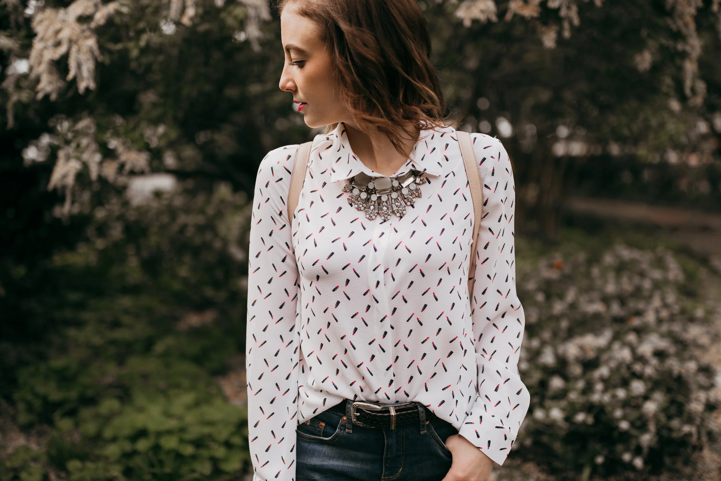 - A fun blouse. I scored my favorite blouse from Peridot Boutique (a small and stylish boutique located in Queen Anne, Seattle). The blouse is covered in a fun lipstick print which was the selling point for me. I love a top with a playful print, color or pattern. It adds a little life to any outfit you wear and it’s always a fun conversation starter. I can’t even count how many compliments I’ve received on it thus far!